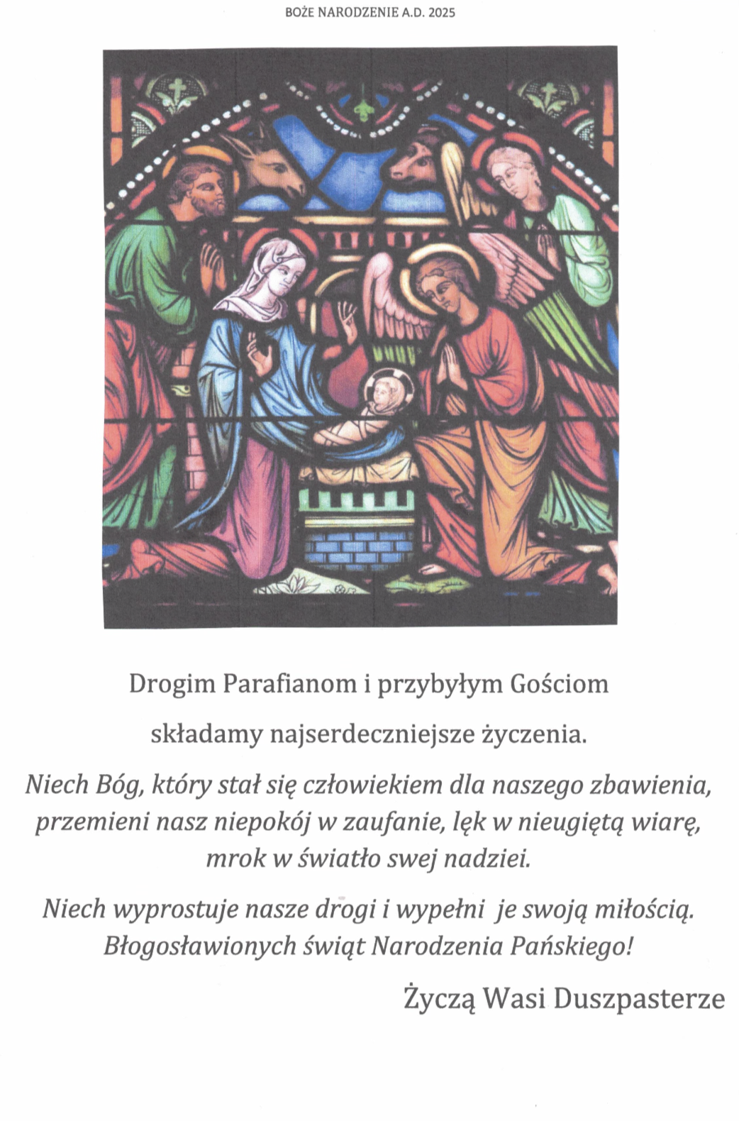4. W święta Bożego Narodzenia msze św. według porządku niedzielnego. W święta nie będzie Adoracji w ciszy i wieczornych Nabożeństw.
