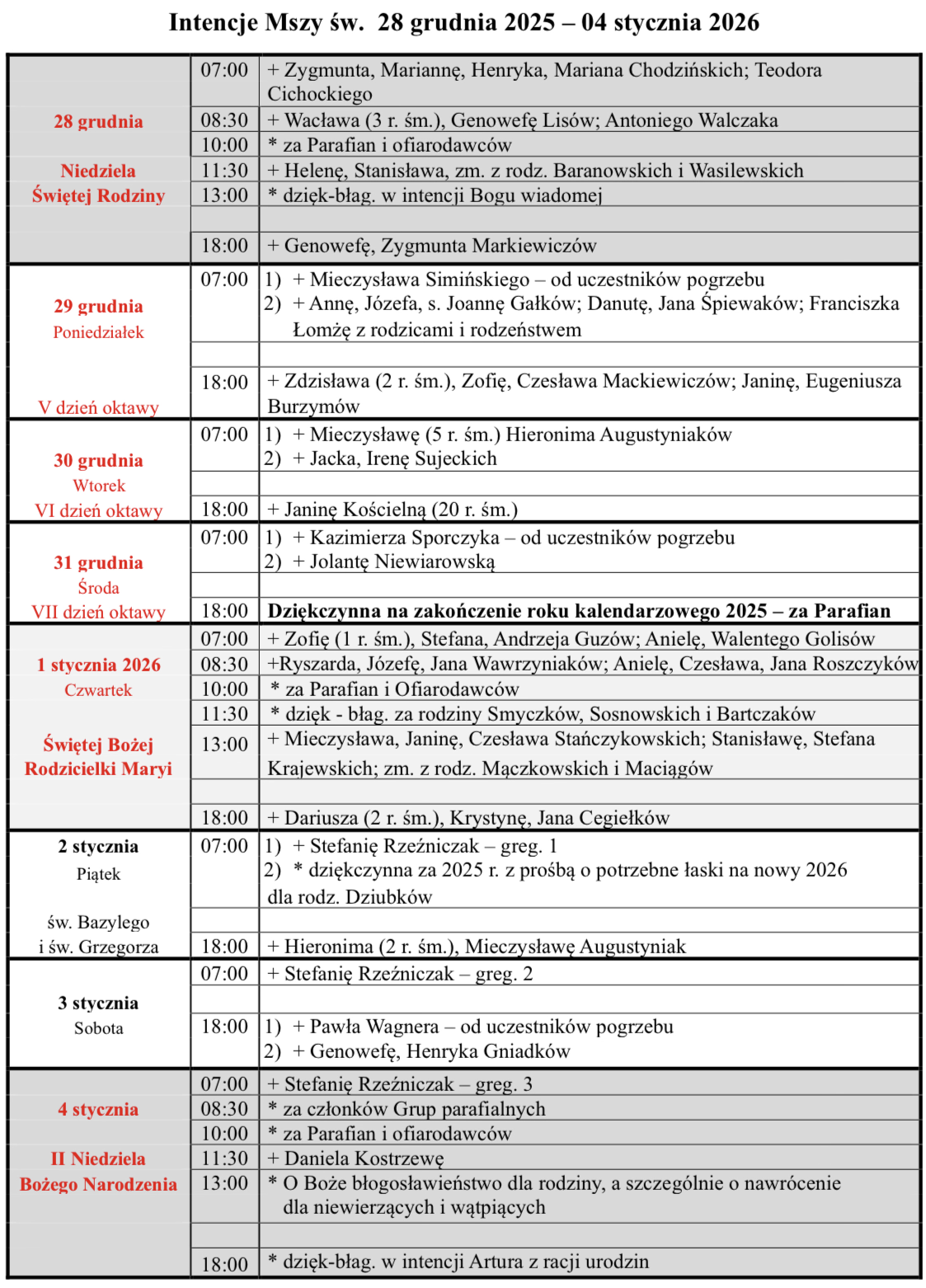 6:40 -Godzinki 7:00; 8.00 - Różaniec 8:30; 9.30 - Wypominki; 10:00; 11:30; 13.00; 18.00
