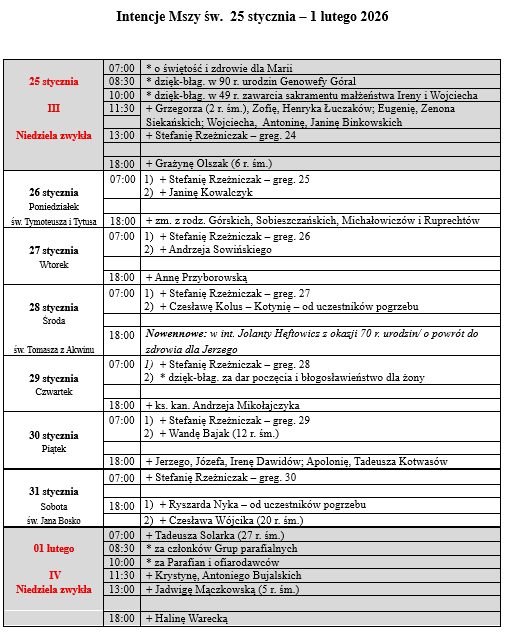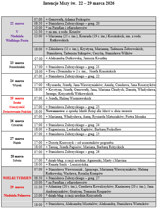 6:40 -Godzinki 7:00; 8.00 - Różaniec 8:30; 9.30 - Wypominki; 10:00; 11:30; 13.00; 18.00
